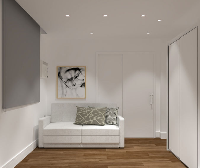 Pensando nisso, a paleta de cores neutras prevaleceu com o uso da cor cinza, branco, tons amadeirados, que aparecem nos móveis soltos e no piso, e a cor verde na cadeira e poltronas.